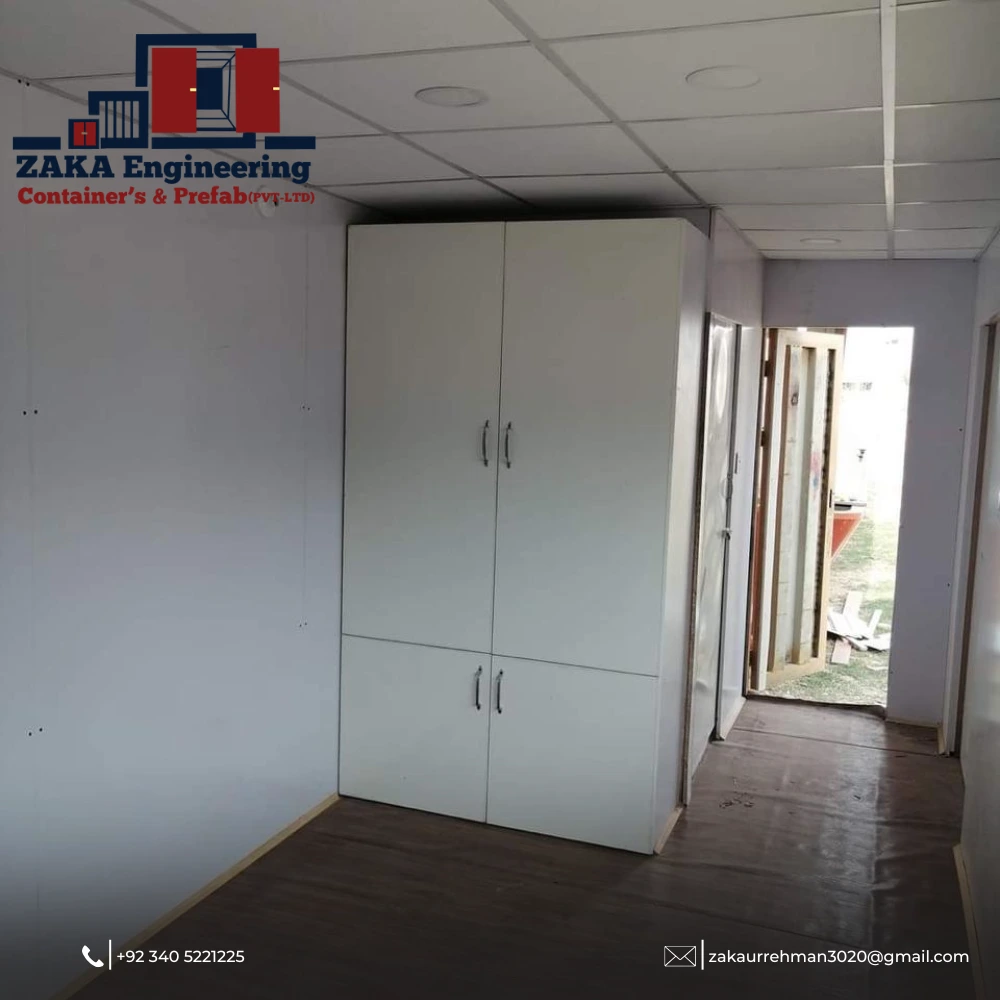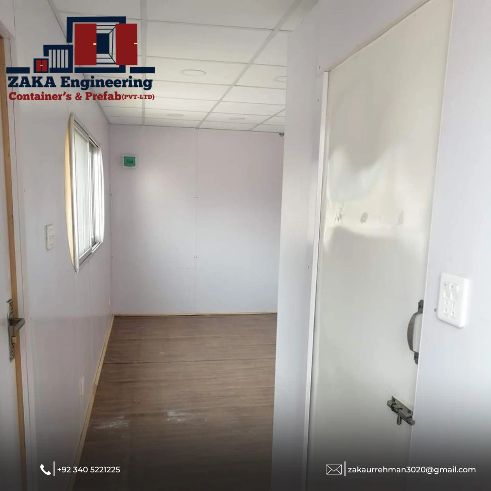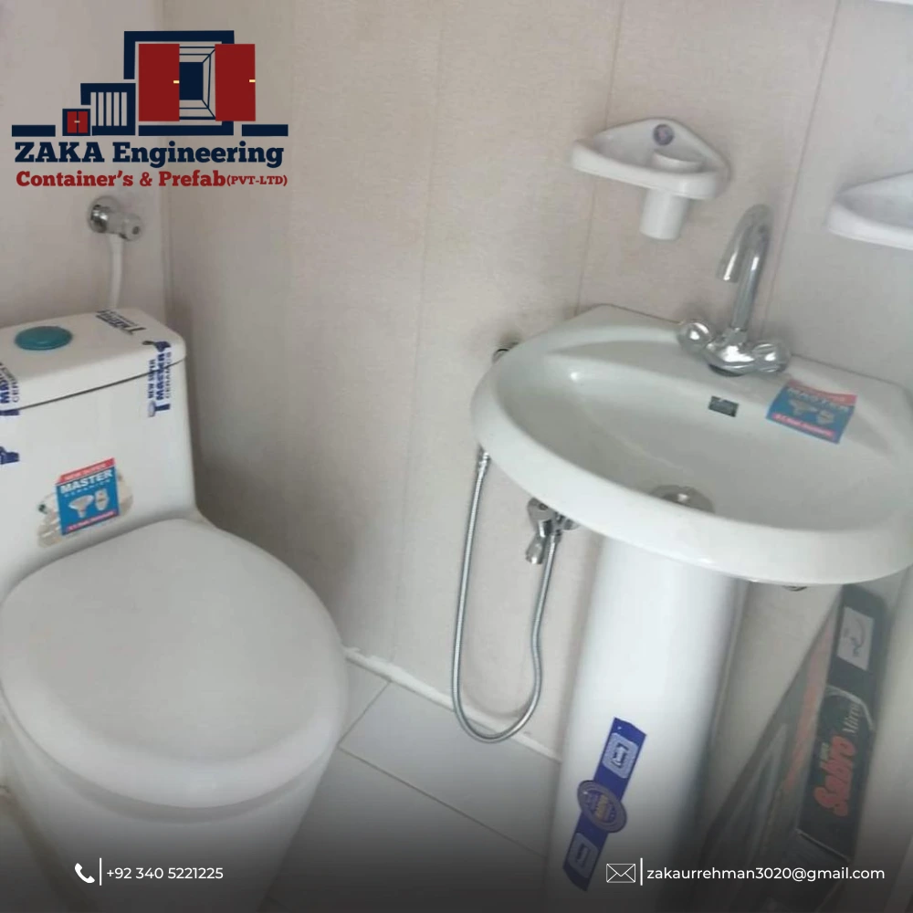 The interior is fully equipped with essential office and utility features, including clean flooring, a storage cabinet section, and a compact washroom with a toilet and sink — offering both functionality and convenience for everyday use.