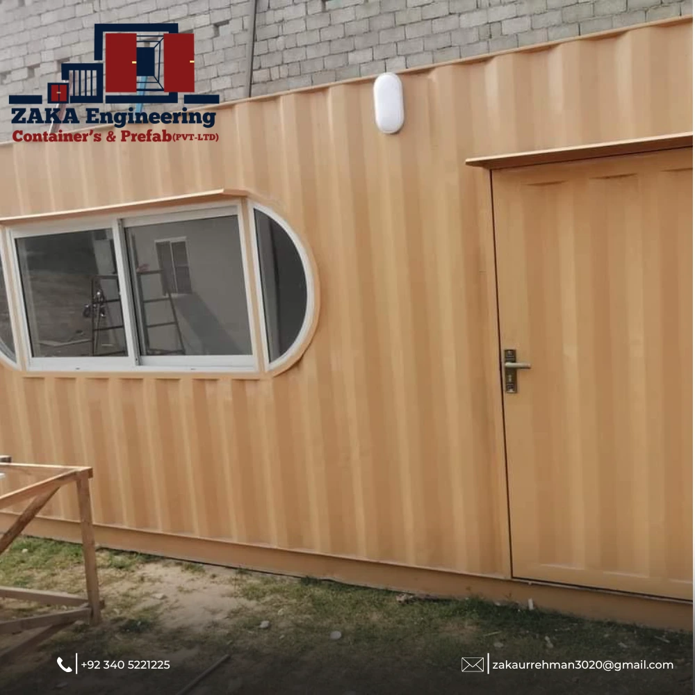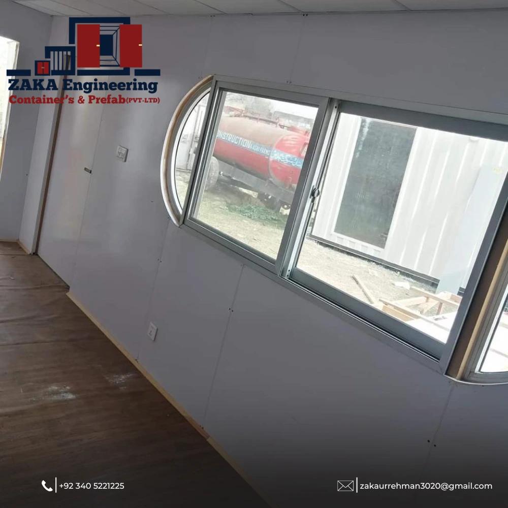 This office container unit features a secure entrance door, insulated walls, and sliding windows to ensure ventilation and natural light. The exterior showcases a durable paint finish, while the interior layout is designed to provide a compact yet functional workspace.
